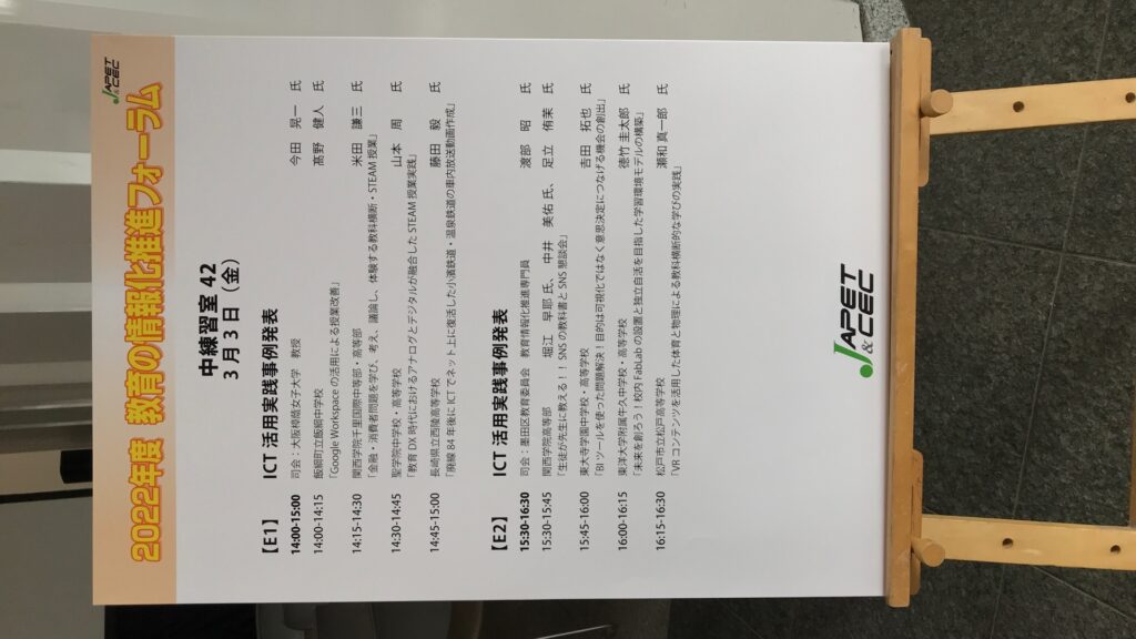 2023年3月18日 / 最終更新日 : 2023年3月18日 akira ICT 2022年度 教育の情報化推進フォーラム開催! Tweet 2023年3月4日(金)〜5日(土)、JAPET&CEC主催「2022年度 教育の情報化推進フォーラム」が4年ぶりにリアルで開催。この3年間はZOOMでのオンライン開催だった。やはり対面での開催の方が臨場感がある。 今年の「夢コンテスト」では授賞式での表彰状の授与の仕事が回ってきた。「ICT活用実践事例発表」の担当は全て高等学校の受賞校であった。高等学校の内容はやはりレベルが高い。 事例発表1-1 事例発表1-2 全体セッション Follow me! FacebookXBlueskyHatenaPocketCopy コメントを残す コメントをキャンセルメールアドレスが公開されることはありません。 ※ が付いている欄は必須項目ですコメント ※ 名前 ※ メール ※ サイト
