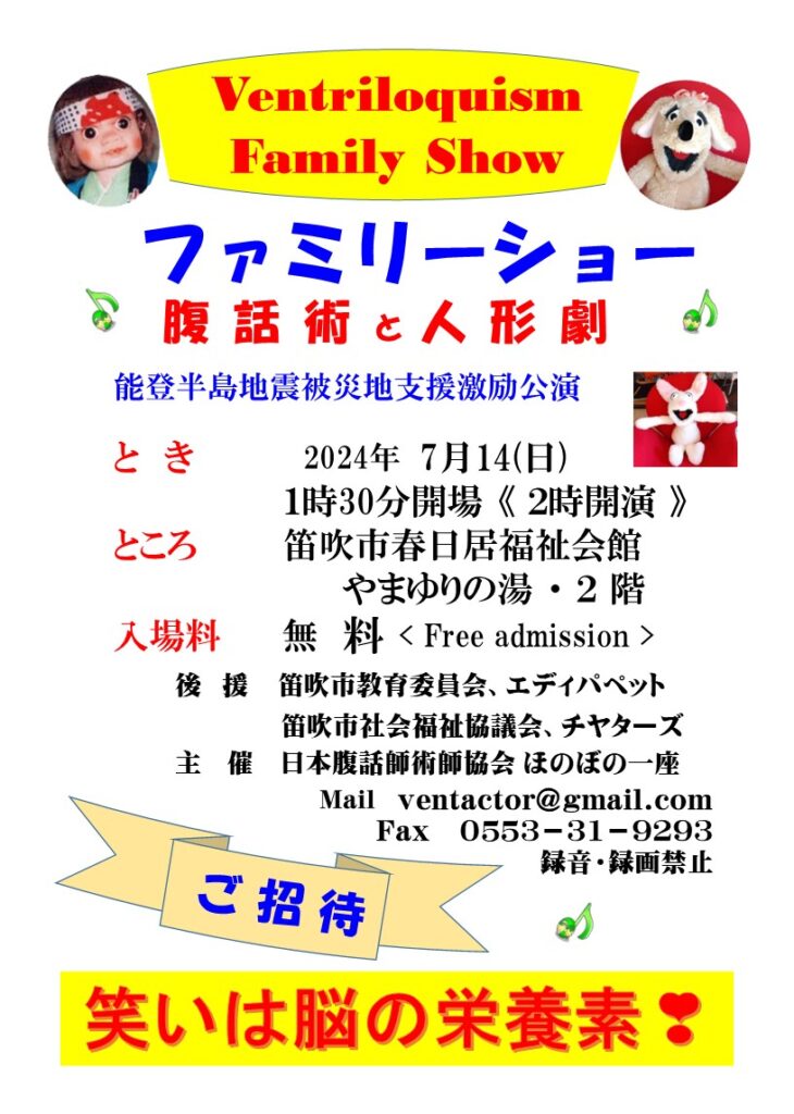 ちょっと遅くなりましたが、「ファミリーショー・腹話術と人形劇」の報告です。2024年7月14日(日)、山梨県笛吹市春日居福祉会館で「日本腹話術師協会 ほのぼの一座」の公演がありました。私も一座に加えていただき、半年ぶりの腹話術の演技に臨みました。